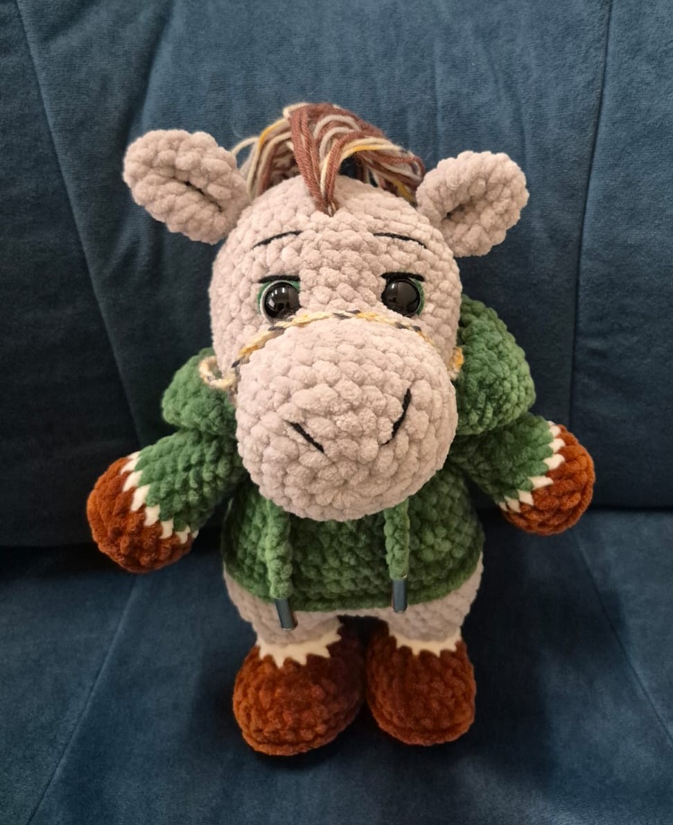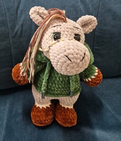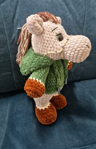 Вязаная лошадка крючком из плюшевой пряжи. Высота 27 см.