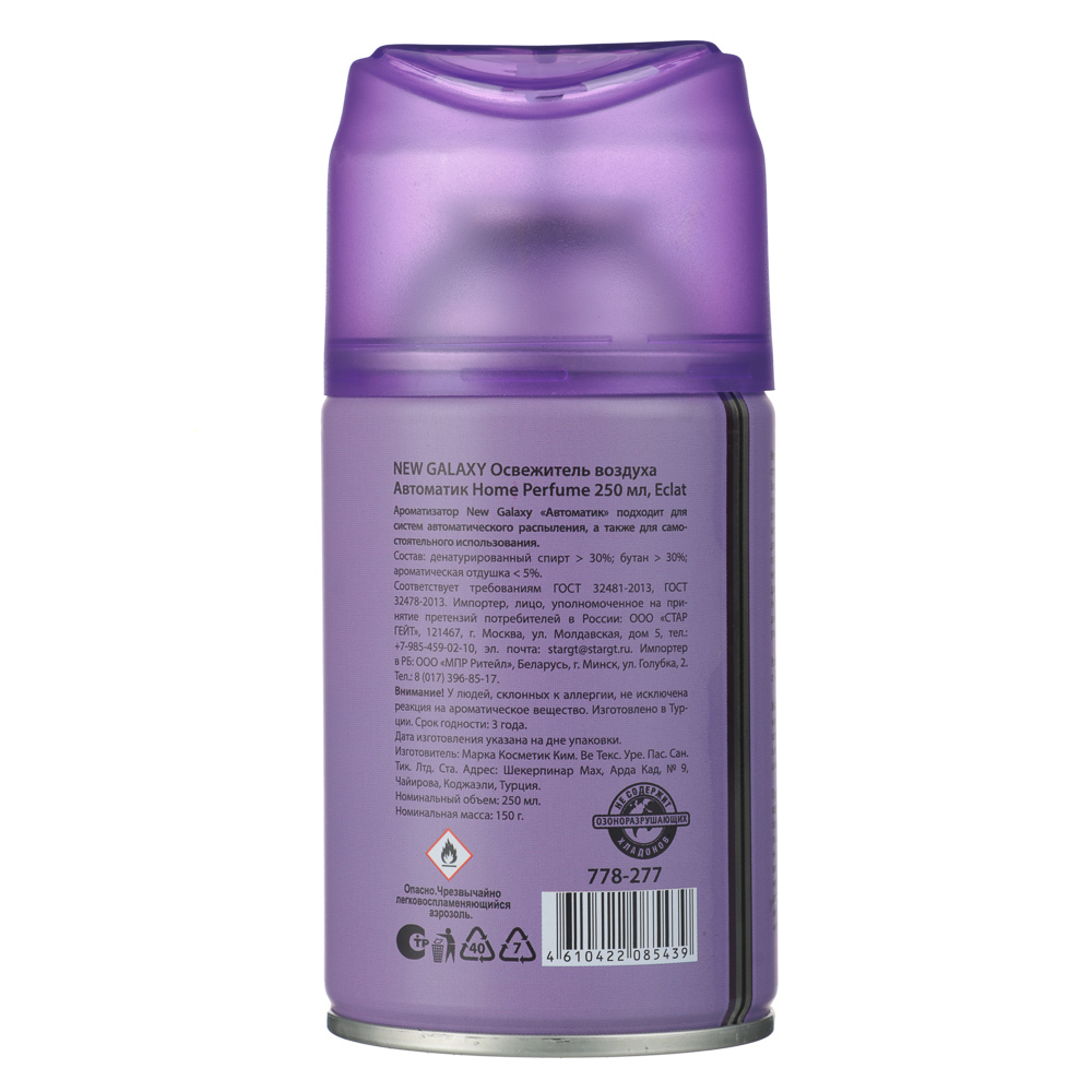 Освежитель воздуха Автоматик Home Perfume Eclat, имеет современную формулу «3in1 Air Care» которая гарантирует тройное действие; эффективно нейтрализует и поглощает неприятный запах, наполняет помещение неповторимым ароматом, придает ощущение свежести и чистоты. Чистота и красивый аромат в доме – неотъемлемые атрибуты ощущения гармонии. Освежитель воздуха мгновенно наполнит комнату благоухающим ароматом цветочного французского парфюма. Подходит для использования в любых помещениях: в ванной комнате, санузле, в гардеробной и прихожей. Универсальный сменный баллон подходит для всех автоматических диспенсеров. Объем: 250 мл.