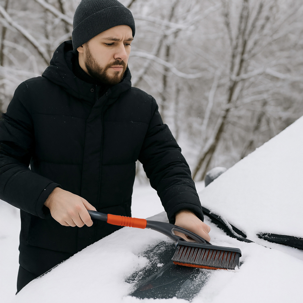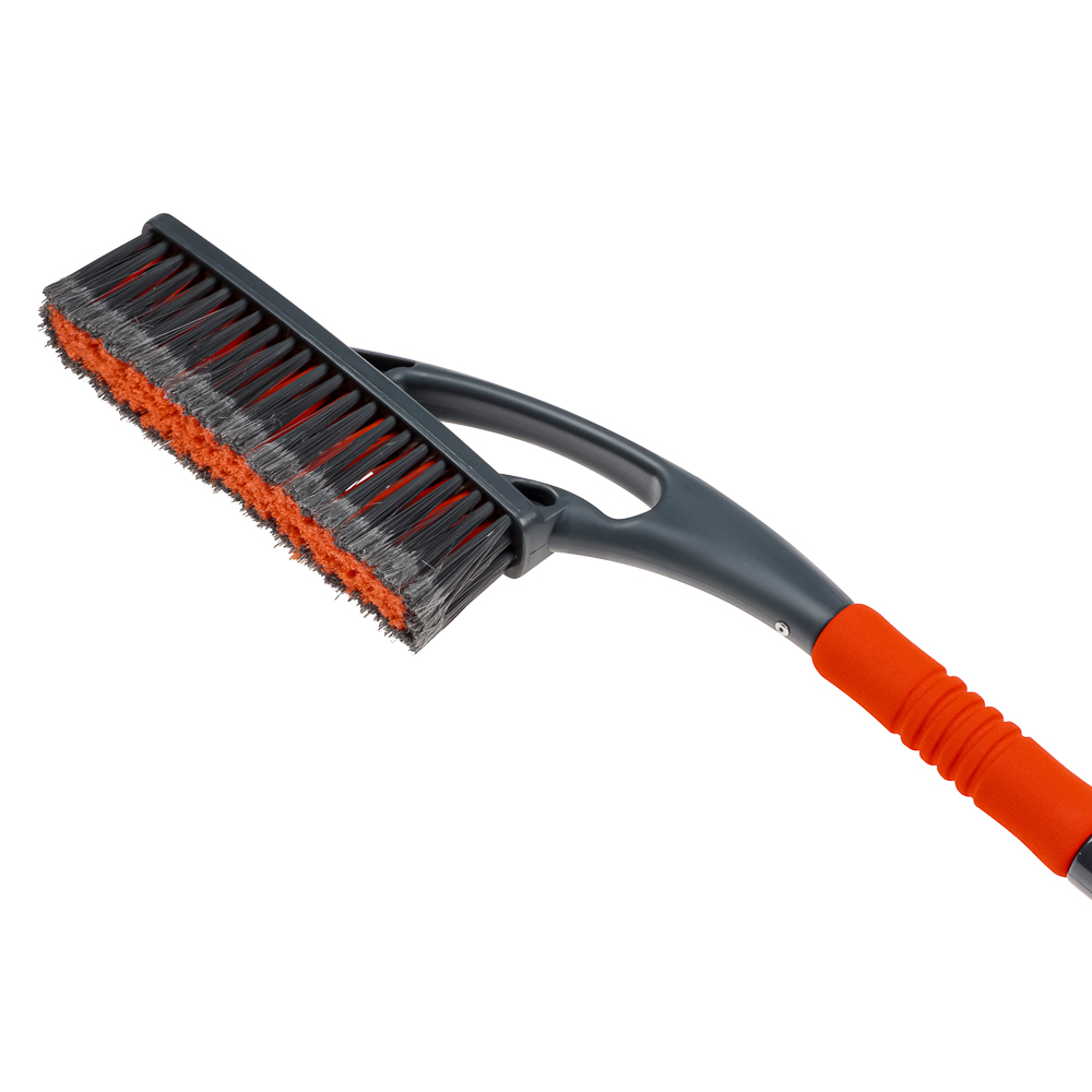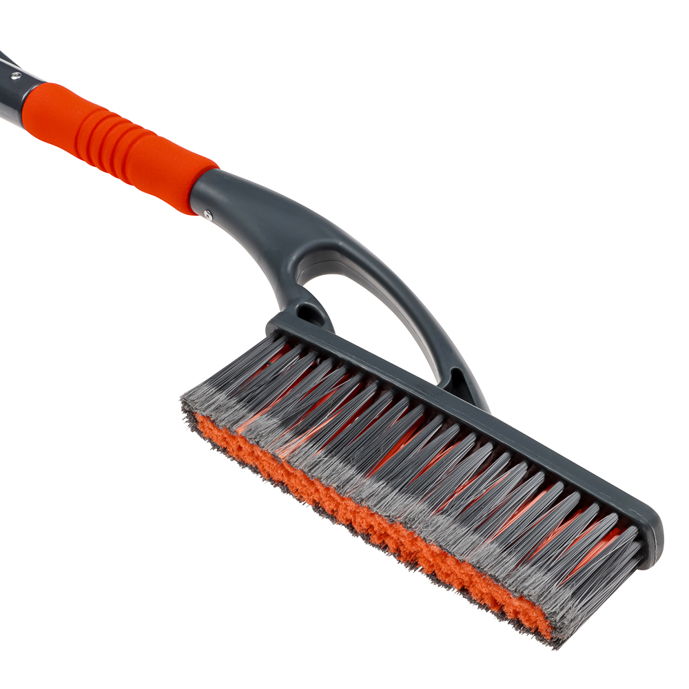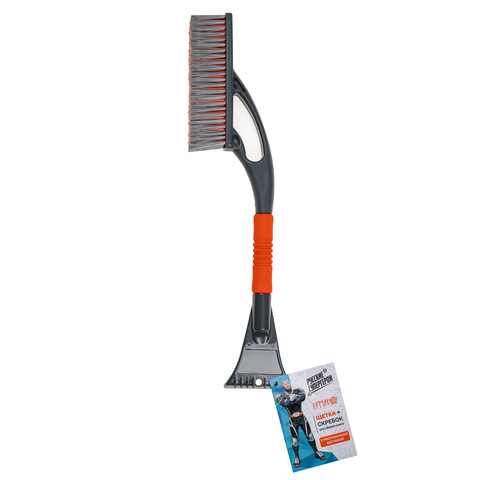 Щетка Ермак, для очистки автомобиля от снега, наледи, листьев, воды или грязи. Длина щетки позволяет полностью смести снег с крыши машины. С одной стороны щетки расположен прочный скребок, который без труда справится со льдом, образовавшимся на стекле автомобиля. На другом конце – щетка с длинной прочной щетиной, которая быстро и качественно поможет очистить автомобиль от опавших листьев, пыли или снега. Мягкое покрытие на ручке надежно ложится в руку и не замерзает, поэтому инструмент можно использовать без перчаток. Размеры: 59х10см.