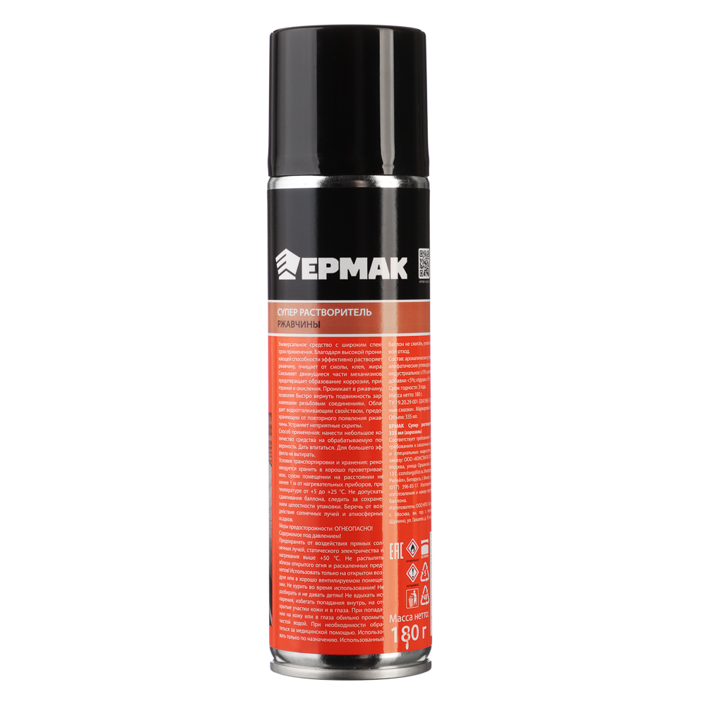 Супер растворитель ржавчины Ермак, в форме аэрозоля – это универсальное средство с широким спектром применения, которое может применяться в быту, промышленности и ремонте. Мощная формула быстро и эффективно растворяет ржавчину, одновременно предупреждая образование новой коррозии. Очищает от смол, жиров и клея. Подходит для смазывания движущихся частей механизмов, предупреждая возникновение окисления, коррозии, нагара и скрипов. Быстро возвращает подвижность заржавевшим резьбовым соединениям. Обладает водоотталкивающими свойствами. В комплект входит распылительная трубка. Объем: 335 мл.